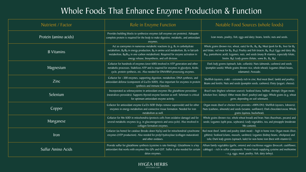 This snapshot highlights key whole foods that support enzyme production and activity, from protein and B vitamins to essential minerals like magnesium, zinc, and selenium. Small, intentional choices at each meal can make a big impact on metabolic health and resilience.
