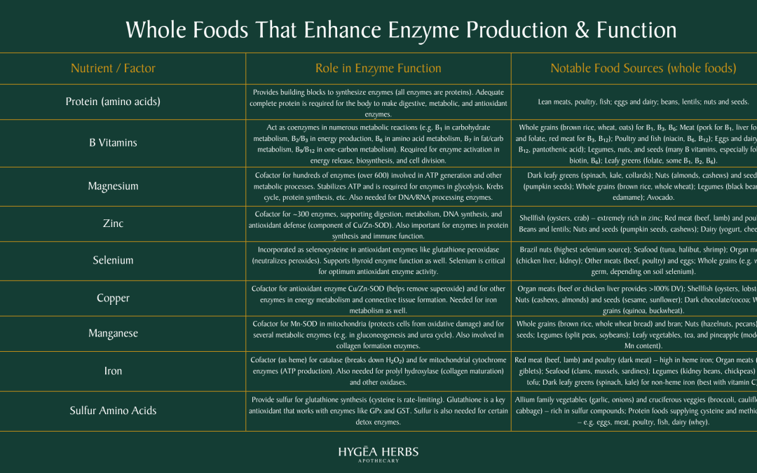 This snapshot highlights key whole foods that support enzyme production and activity, from protein and B vitamins to essential minerals like magnesium, zinc, and selenium. Small, intentional choices at each meal can make a big impact on metabolic health and resilience.
